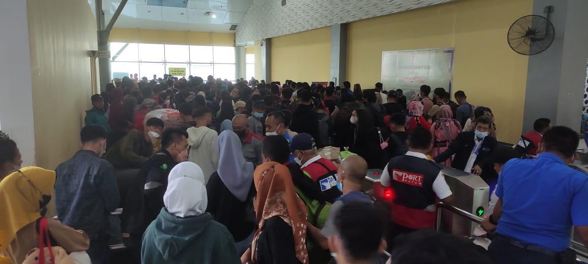 Terlihat suasana Pelabuhan Ferry Domestik Sekupang sangat padat sekali. Ribuan warga berdesak desakan memasuki pintu pelabuhan. Sementara di dalam pelabuhan juga terdapat ribuan warga.