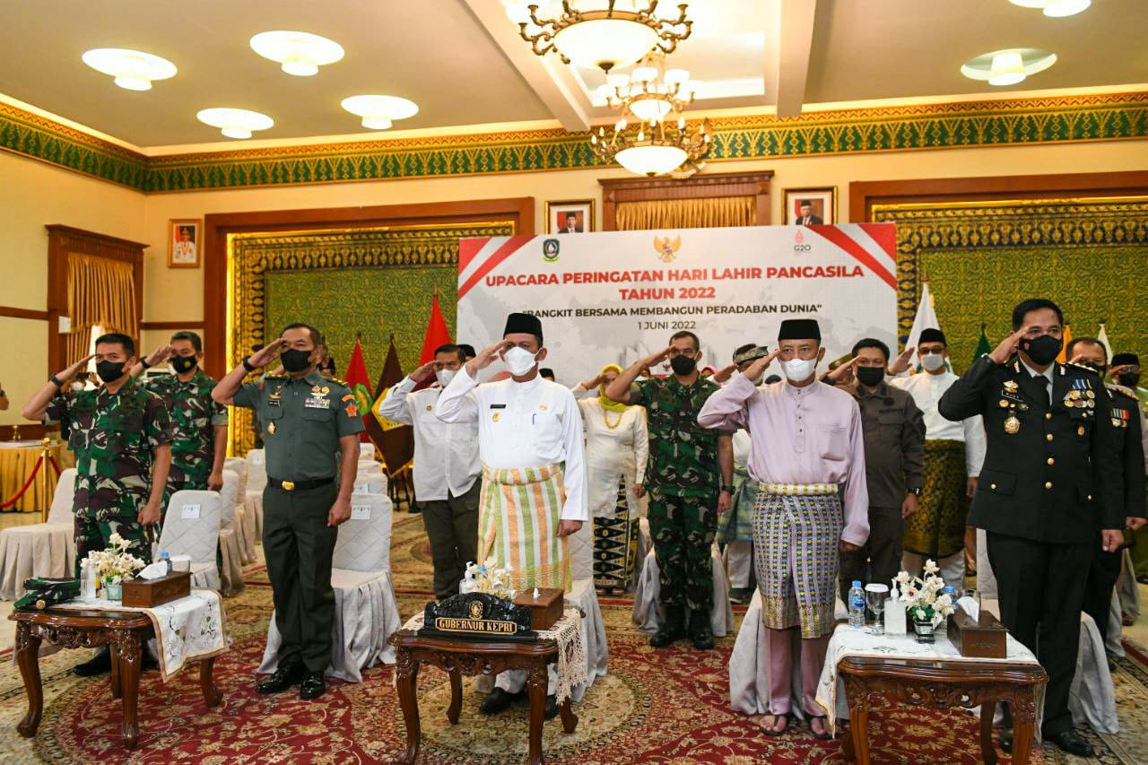 HARAPANMEDIA.COM, TANJUNGPINANG – Gubernur Kepulauan Riau (Kepri), Ansar Ahmad beserta jajaran Forkompimda Kepri mengikuti Upacara Peringatan Hari Pancasila tingkat nasional secara virtual di Gedung Daerah, Tanjungpinang, Rabu (1/6/2022).