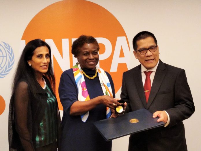 Penyerahan Penghargaan UNPA kepada Kepala BKKBN Dr. (H.C) dr. Hasto Wardoyo, Sp. OG (K) melalui Deputi Bidang Pelatihan, Penelitian, dan Pengembangan (Lalitbang) BKKBN Prof. drh. Muhammad Rizal Martua Damanik, MRepSc, PhD yang diserahkan oleh Eksekutif Director UNFPA Kantor Pusat PBB New York, Dr Natalia Kanem kepada BKKBN di New York, Amerika Serikat.
