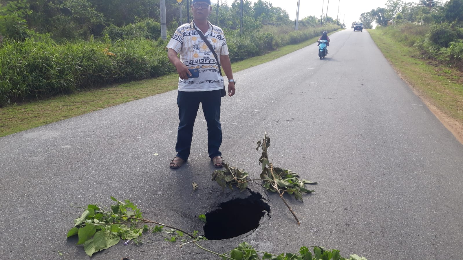 “Bisa kita lihat, dalamnya saja hampir 1 meter begitu juga lebarnya hampir setengah meter. Jadi sangat membahayakan ketika mobil, khususnya pengendara sepeda motor ketika menabrak jalan yang amblas,” terangnya.