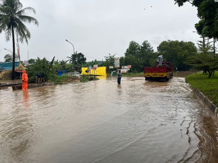 Curah hujan yang tinggi, dan aliran meluap ke jalan membuat drainase di lokasi tidak sanggup menampung debit air yang tinggi karena hujan.