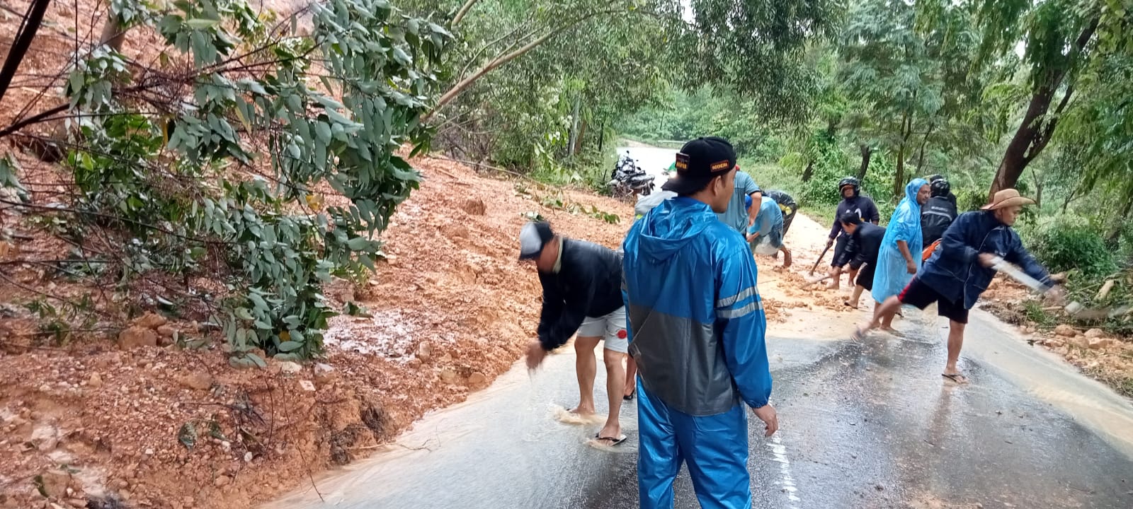 Diakuinya saat ini warga tengah bahu-membahu bersama perangkat RT dan RW dalam membersihkan material tanah dan batu yang berasal dari atas bukit. Menyebabkan kondisi lalu lintas, hanya satu lajur yang bisa dilalui yakni jalur untuk warga agar dapat keluar.