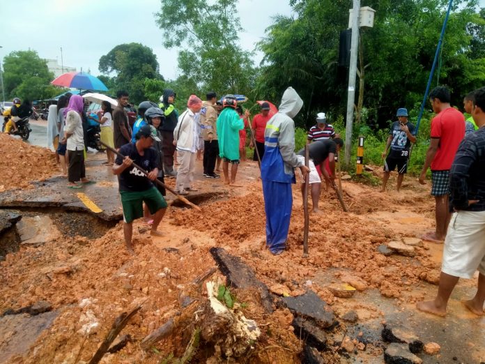 HARAPANMEDIA.COM, BATAM – Warga Sungai Raya, Kecamatan Sembulang, Kecamatan Galang, Kota Batam, Provinsi Kepulauan Riau (Kepri) terpaksa membongkar tanah timbunan di jalan Trans Barelang yang amblas. Pembongkaran dilakukan karena genangan air saat hujan turun berdampak ke rumah mereka.