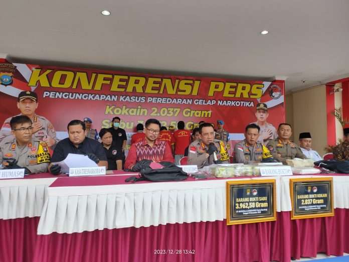 Dengan mengenakan baju tahanan reserse narkoba, MMY berada dibarisan paling kiri saat dihadirkan dalam konperensi pers di Polresta Barelang yang dihadiri Ketua DPRD Kota Batam.