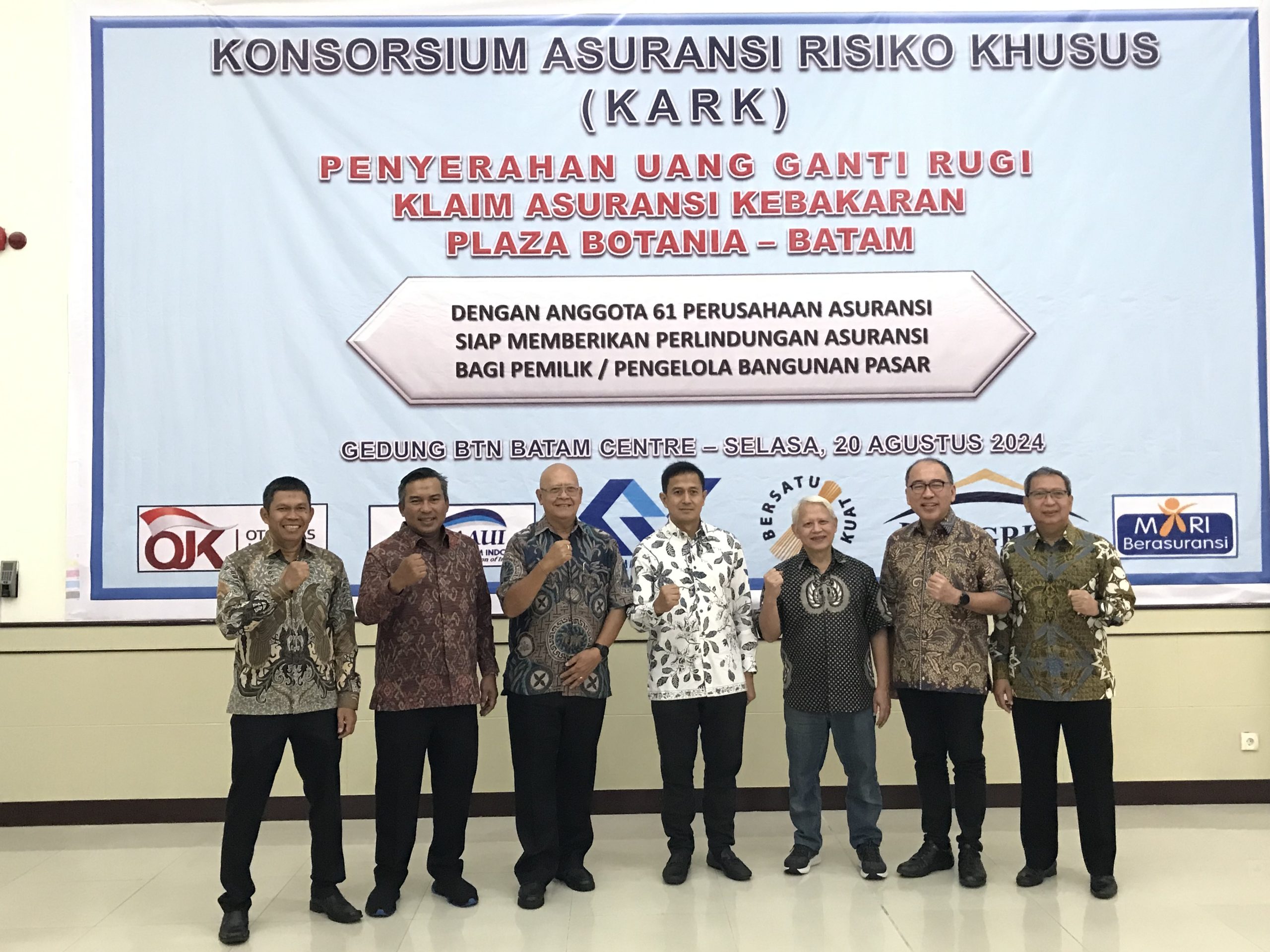 HARAPANMEDIA.COM, BATAM – Masih ingat kebakaran Mall Botania Batam, kini Pengurus Konsorsium Asuransi Risiko Khusus (KARK) bersama PT Asuransi Binagriya Upakara menyerahkan ganti rugi klaim asuransi kebakaran Plaza Pasar Botania tersebut. Ganti rugi klaim asuransi itu sebesar Rp 34 milliar lebih diserahkan di Bank BTN Cabang Batam.