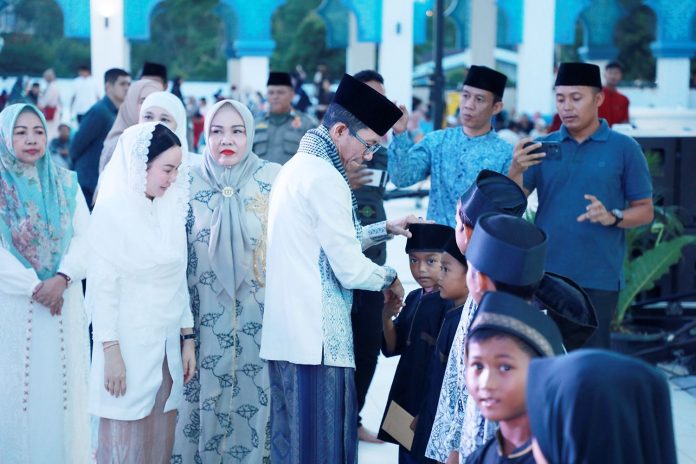 HARAPANMEDIA.COM,BATAM – Ribuan warga memadati Masjid Agung Raja Hamidah, Batamcentre untuk mengikuti buka puasa bersama yang digelar Pemerintah Kota Batam, Sabtu (28/2/2026). Dalam acara itu, Wali Kota Batam, Amsakar Achmad, bersama Wakil Wali Kota Batam, Li Claudia Chandra, menyerahkan santunan untuk 1.200 anak yatim.